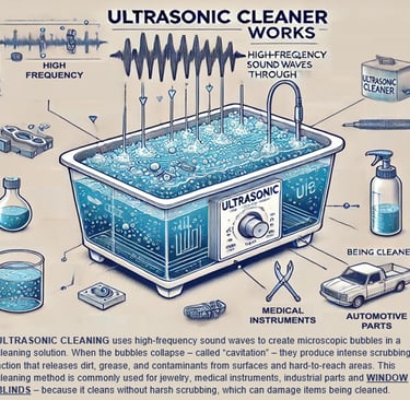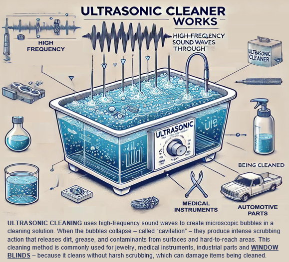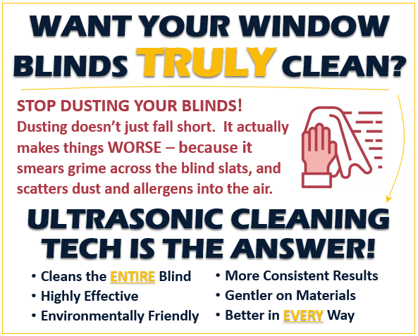 Ultrasonic blind cleaning is the only true way to clean window blinds, as the process removes everything --- dust, dirt, allergens, grime, etc. -- restoring your blinds to like-new condition with care and precision.